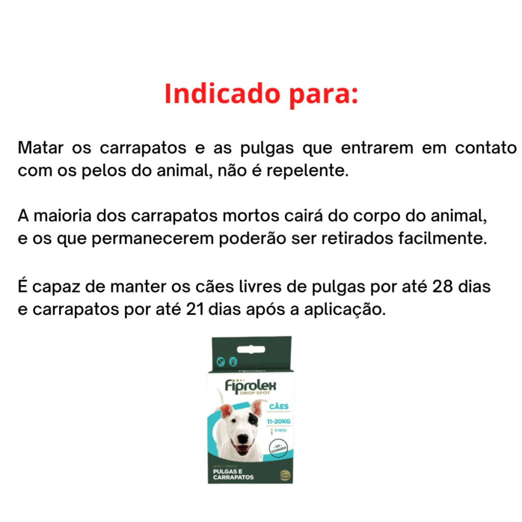 Benefícios:Controle eficaz contra pulgas e carrapatos: Elimina pulgas adultas e combate infestações de carrapatos, com efeito visível em 24 horas.Proteção prolongada: Eficácia por até 30 dias, evitando novas infestações.Fácil aplicação: Produto tópico de 1,34 ml, ideal para cães de 11 a 20 kg, aplicado diretamente na pele do animal.Resistente à água: O produto continua eficaz mesmo após 48 horas de exposição à água.Seguro e confiável: Formulação segura para cães dentro da faixa de peso indicada, proporcionando um tratamento eficaz e sem complicações.Cuidados:Uso exclusivo para cães: Não deve ser utilizado em gatos nem em outros tipos de animais.Peso indicado: Somente para cães que pesam entre 11 e 20 kg.Idade mínima: Não utilizar em filhotes com menos de 8 semanas de idade.Evitar o contato com a área tratada: Após a aplicação, evite que o animal lamba ou tenha contato com a área tratada durante as primeiras 24 horas.Manter fora do alcance de crianças: Armazene o produto em local seguro, longe do alcance de crianças.Evitar banho imediato: Evite molhar a área tratada até 48 horas após a aplicação para garantir a máxima eficácia.Consultar um veterinário: Caso o seu cão apresente qualquer reação adversa ou esteja com alguma condição de saúde pré-existente, consulte um veterinário.Mantenha seu cão livre de pulgas e carrapatos com o Fiprolex Drop Spot — a proteção que ele merece de maneira prática e eficaz!