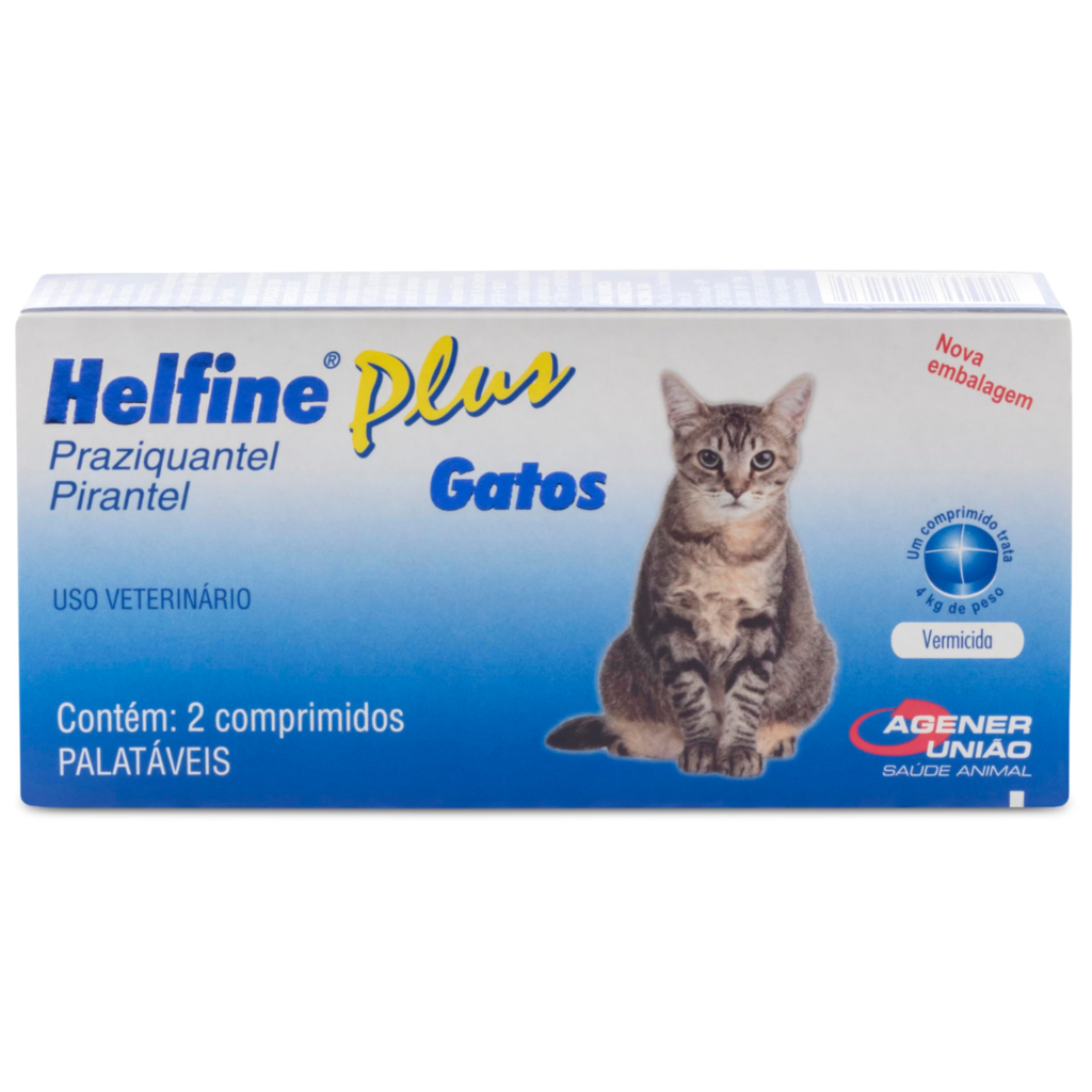 Helfine Plus Vermífugo para Gatos 2 ComprimidosProduto: Vermífugo para gatosQuantidade: 2 comprimidosMarca: Helfine PlusPrincipais Benefícios:Eficácia contra vermes intestinais: Auxilia no controle de infestações por vermes intestinais comuns em gatos, como lombrigas, tênias e ancilostomídeos.Fórmula de amplo espectro: Combate diversos tipos de parasitas intestinais, proporcionando uma desparatização eficaz para gatos de todas as idades.Segurança: Produto desenvolvido para ser seguro para gatos, com formulação que respeita as necessidades específicas da espécie.Facilidade de administração: Comprimidos de fácil aplicação, podendo ser administrados diretamente ou misturados com a comida do gato.Comprimidos práticos: Embalagem com 2 comprimidos, ideal para um tratamento rápido e eficaz, ou para gatos de pequeno porte.Indicações:Prevenção e tratamento de infestações por vermes intestinais em gatos, como:Lombrigas (Ascaris)Tênias (Dipylidium)Ancilostomídeos (Ancylostoma)Modo de Uso:Administre 1 comprimido por gato de acordo com o peso recomendado pelo fabricante (geralmente em torno de 1 comprimido para gatos com até 5 kg de peso). Em caso de infestação severa, consulte um veterinário para ajustes no tratamento.Posologia: O tratamento pode ser repetido após 15 a 30 dias, conforme orientação veterinária.Precauções:Consulte um veterinário: Antes de iniciar o tratamento, consulte um profissional para garantir a dosagem e a necessidade do uso.Armazenagem: Conservar em local seco, fresco e fora do alcance de crianças e animais.Uso em gatinhos: Não é indicado para gatos com menos de 6 semanas de idade sem orientação veterinária.Composição:Composição ativa específica para o tratamento de vermes intestinais em gatos, conforme informações do fabricante (para detalhes, consulte o rótulo do produto).Produto recomendado para:Gatos de qualquer idade (sempre com a supervisão veterinária para gatinhos de menos de 6 semanas de idade).