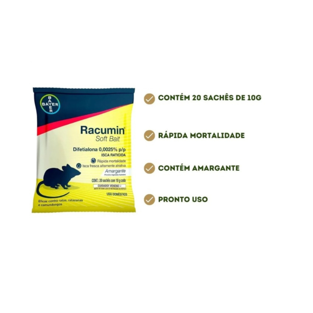 A Racumin Soft Bait é uma isca raticida de última geração, desenvolvida para o controle eficaz de ratos, ratazanas e camundongos em ambientes residenciais, comerciais e rurais. Embalada em 20 sachês de 10g cada (totalizando 200g), a fórmula possui textura pastosa ultrapalatável e aroma atrativo, garantindo maior consumo pelos roedores mesmo em locais com outras fontes de alimento.