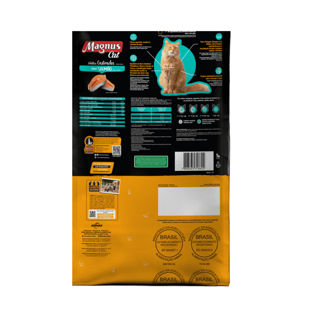 Magnus Cat Premium Gatos Adultos Castrados Sabor Salmão é um alimento seco completo, formulado com precisão para atender as exigências do gato adulto castrado, de qualquer raça. Nutritivo e saboroso, agrada ao paladar diferenciado do gato, provendo benefícios a sua vida. BIO COMPLEX é um exclusivo complexo de ingredientes que promovem benefícios para o seu gato. Sabor irresistível: feito com ingredientes de alta qualidade. Equilíbrio da flora intestinal: Prebióticos, Fibras e Extrato de Yucca, a combinação destes ingredientes auxilia na formação das fezes mais. Pele e Pelagem: Ômegas 3 e 6, Biotina, Zinco Quelato, importantes para a manutenção da pele e pelagem sedosa e brilhante. Taurina: aminoácido essencial para o coração e visão.