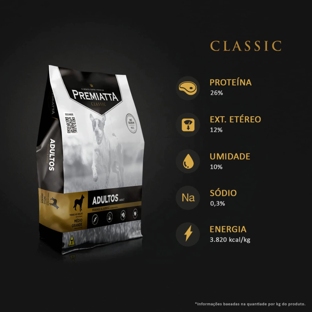 Enriquecida com vitaminas, minerais e ácidos graxos essenciais, como o Ômega 3 e 6, a Premiatta Classic ajuda a fortalecer o sistema imunológico, manter a pele saudável e melhorar a qualidade da pelagem. Além disso, a ração é formulada para apoiar a saúde das articulações, essencial para cães de porte maior, que tendem a ter uma maior pressão sobre suas articulações.