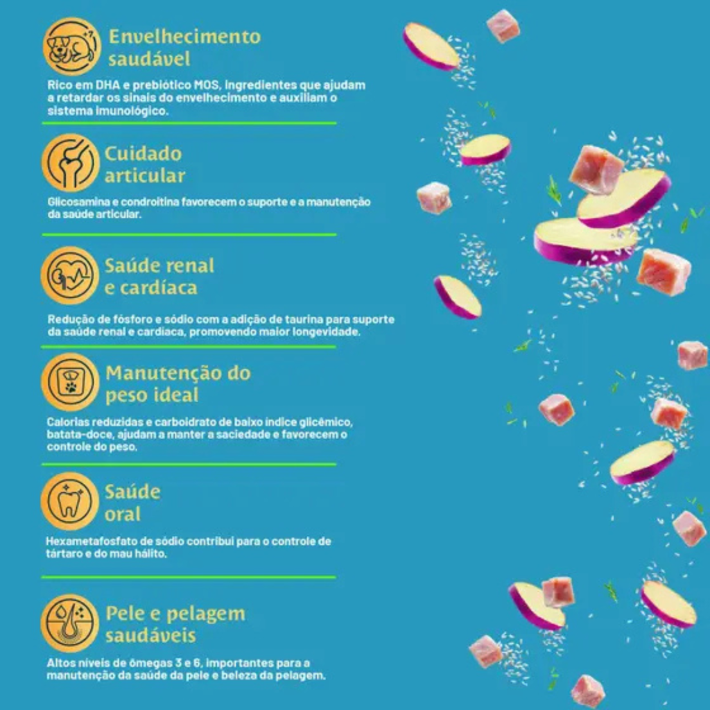 Controle de Peso e Manutenção Corporal: Enriquecida com fibras de alta qualidade e com um controle calórico ajustado, a ração ajuda a manter o peso ideal, prevenindo a obesidade, um problema comum em cães sêniores. Manter um peso saudável é fundamental para evitar sobrecarga nas articulações e problemas de saúde relacionados.