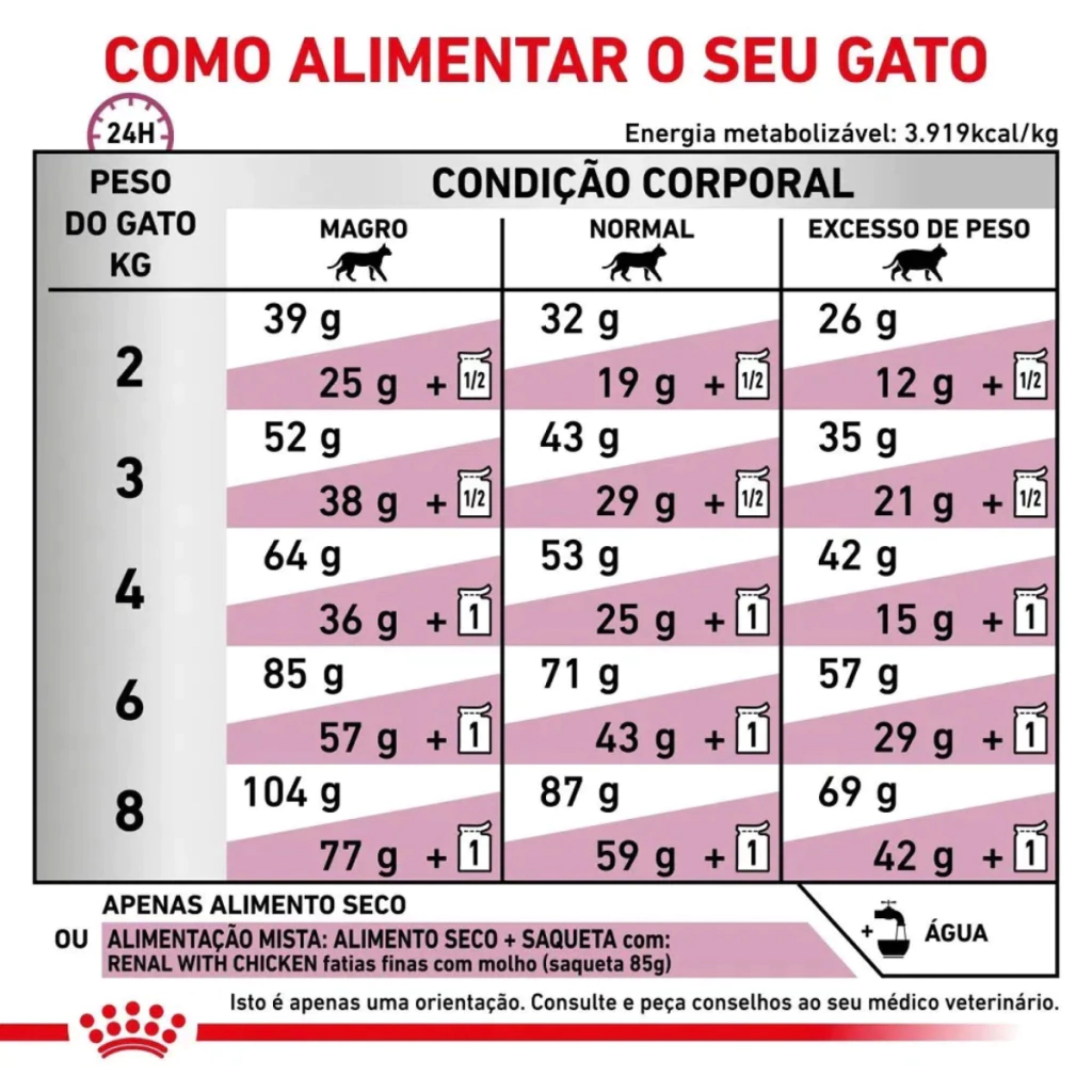 Benefícios:Proteínas de alta qualidade com teor controlado: Menos carga para os rins, enquanto mantém a nutrição essencial.Baixo teor de fósforo: Ajuda a controlar os níveis de fósforo no sangue e a retardar a progressão da insuficiência renal.Complexo antioxidante: Protege as células renais contra o estresse oxidativo e fortalece o sistema imunológico.Ômega-3: Reduz a inflamação renal e favorece a saúde da pele e pelagem.Alta digestibilidade: Ingredientes selecionados que promovem uma digestão fácil e eficiente.Alta palatabilidade: Sabor atrativo, ideal para gatos com apetite reduzido.Indicações:Gatos adultos com insuficiência renal crônica ou doença renal aguda.Gatos com doenças renais que necessitam de uma dieta terapêutica para promover a saúde renal e retardar a progressão da doença.Gatos que necessitam de uma dieta com teor controlado de fósforo e proteínas.Gatos com problemas digestivos relacionados à insuficiência renal ou que precisam de uma alimentação de fácil digestão.Modo de uso:A quantidade recomendada de ração pode variar de acordo com o peso, a condição de saúde e a orientação do veterinário. A monitoração contínua por um profissional veterinário é fundamental para acompanhar a progressão da doença renal e ajustar a dieta conforme necessário.