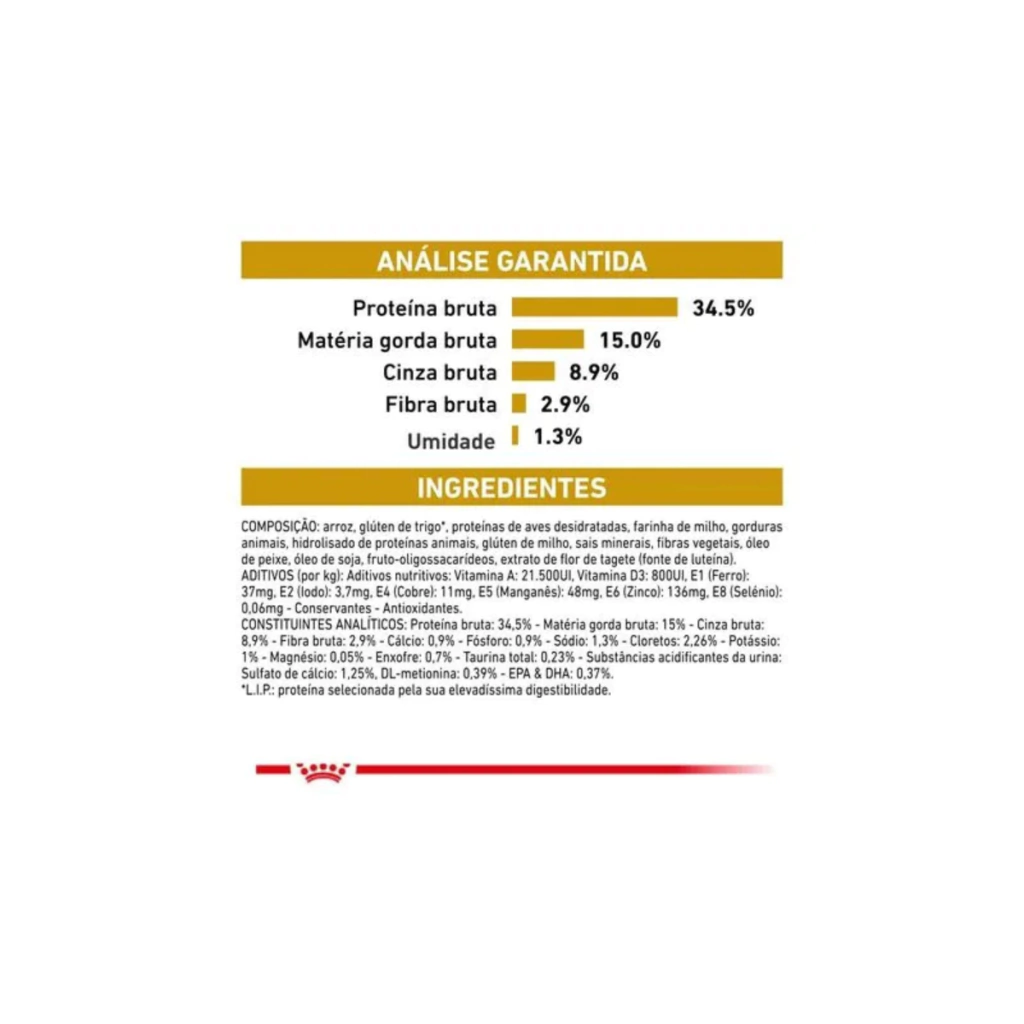 A ração contém níveis controlados de magnésio, um mineral que, quando em excesso, pode contribuir para a formação de cristais de estruvita. O controle de magnésio é fundamental para a prevenção de infecções urinárias e cálculos urinários.Fórmula Completa e Balanceada: