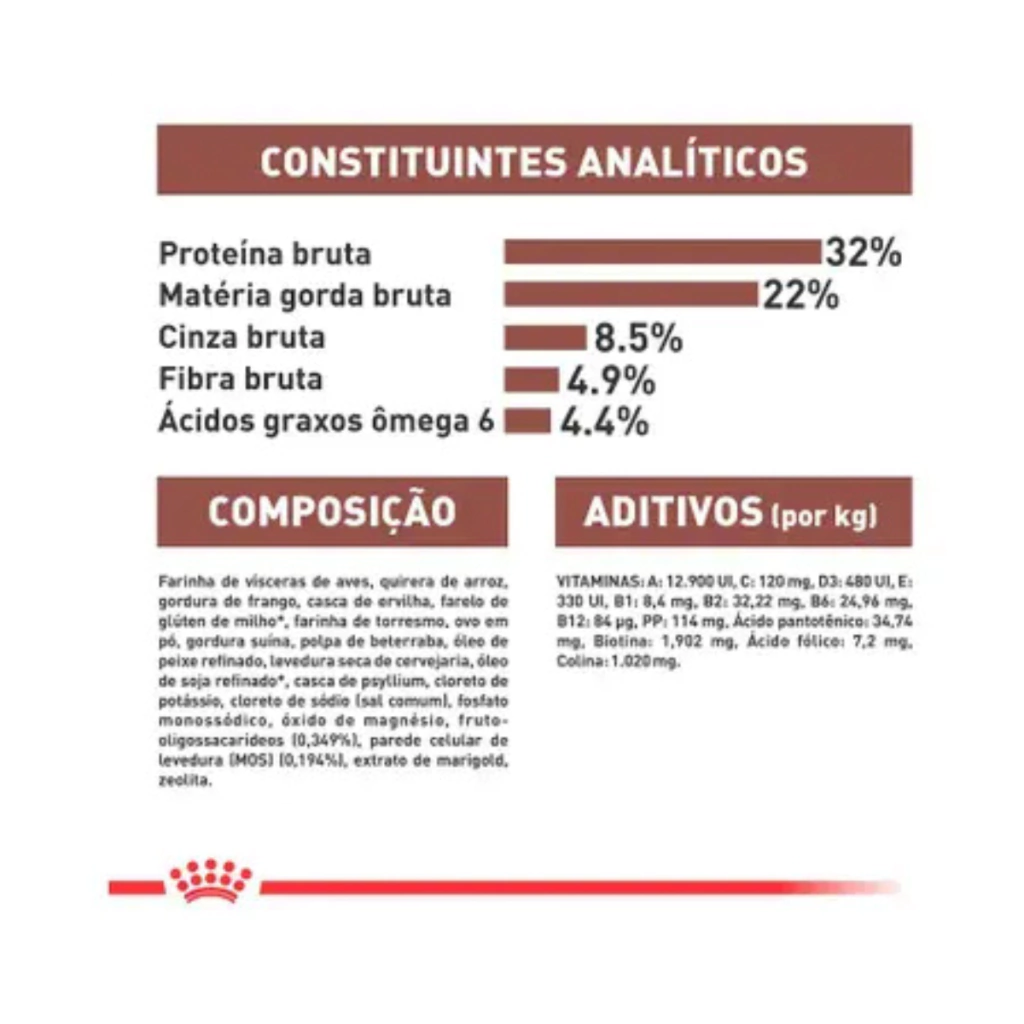 Quirera de arroz, farinha de vísceras de aves, milho integral moído*, gordura suína, gordura de frango, levedura seca de cervejaria, ovo desidratado, farinha de torresmo, polpa de beterraba, óleo de soja refinado*, óleo de salmão, celulose em pó, zeolita, psyllium, fruto-oligossacarídeos, parede celular de levedura (MOS), extrato de Marigold, cloreto de potássio, fosfato monossódico, cloreto de sódio (sal comum), fosfato monocálcico, vitaminas (A, C, E, D3, B1, B2, B6, B12, PP), ácido pantotênico, biotina, ácido fólico, cloreto de colina, sulfato de ferro, sulfato de cobre, óxido de manganês, óxido de zinco, iodato de cálcio, cobre aminoácido quelato, manganês aminoácido quelato, zinco aminoácido quelato, selenito de sódio, fígado de frango, DL-metionina, taurina, antioxidante (BHA). *milho integral moído geneticamente modificado por Bacillus thurigiensis e Streptomyces viridichromogene; óleo de soja refinado produzido a partir de soja geneticamente modificada por Agrobacterium sp.